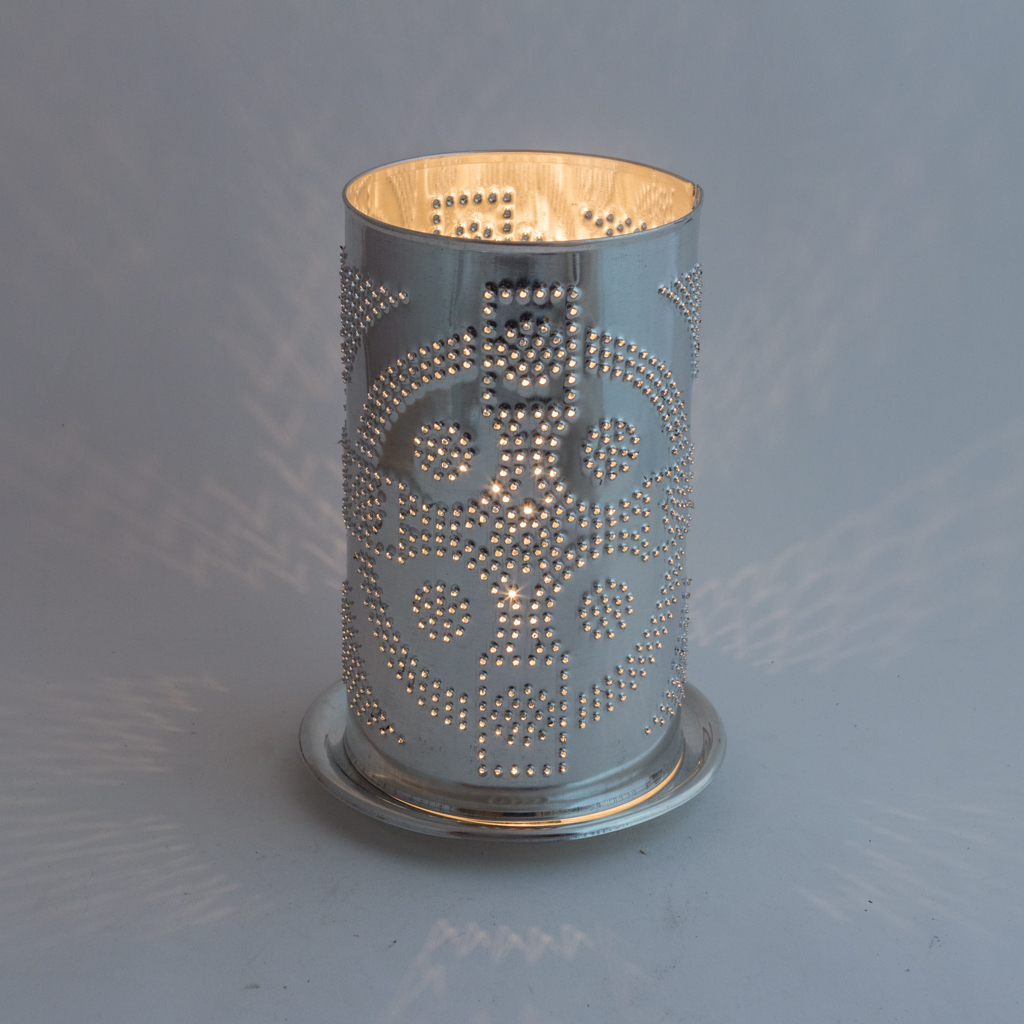 - The pattern has more than 1350 piercings. Height 7.75 inches. Shade 4.375 inches diameter. Plate 5.75 inches diameter.