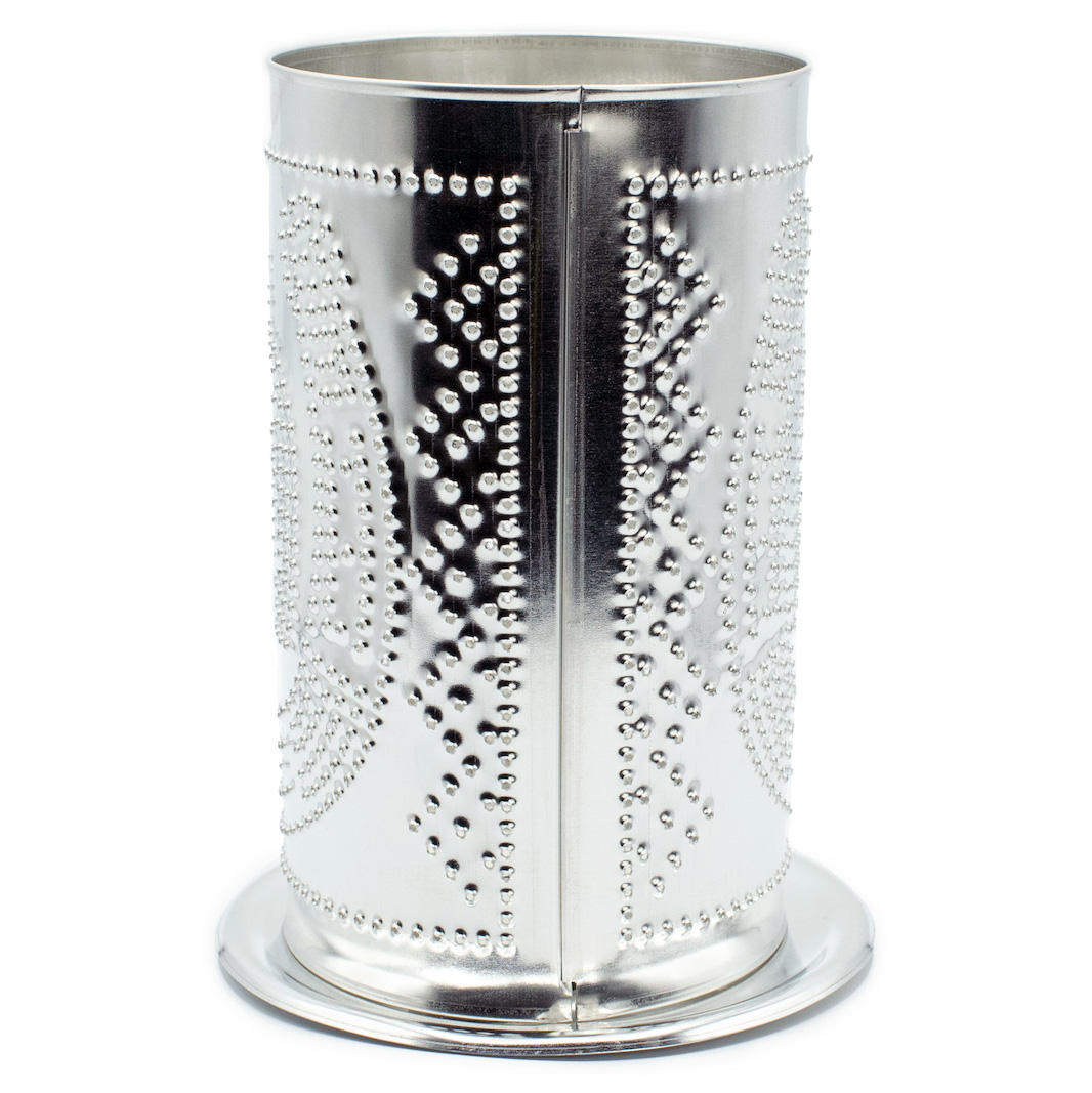 - Pierced shade with stamped base made from tin-plated steel.