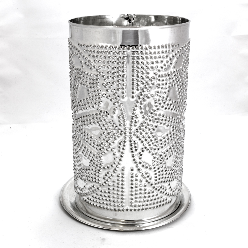 - Pierced shade with stamped base made from tin-plated steel.